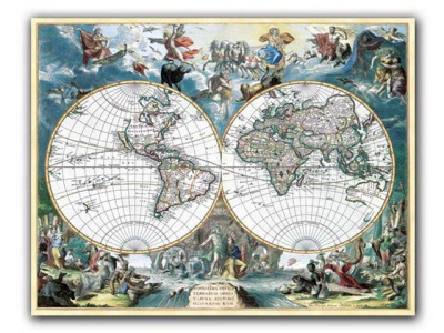 Gorgeous 19.5 x 25 inch framable antique-looking map of the World, first published in 1683 by Johannes de Ram. This reproduction is printed on beautiful Frenchtone Parchment paper