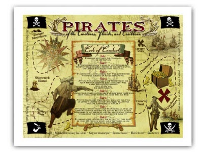 Front of placemat shows Famous Pirates, Pirates Flags, Ships, Weapons. The reverse side shows Pirates Code of Conduct.