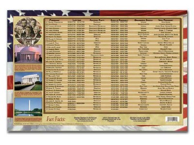 Front of placemat shows a list of the Presidents of the United Estates. Includes President Obama.